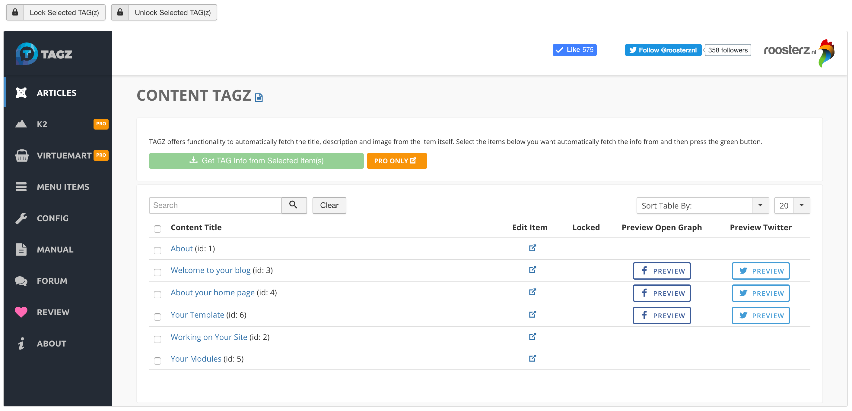 The titles of all Joomla Articles available are displayed here, together with their unique id. Now there are two ways to define OG Tags and Twitter Cards: